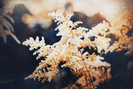 Dry branches of grass and flowers on a winter snowy field. Seasonal cold nature background. Winter landscape details. Wild plants frozen and covered with snow and ice in meadow.