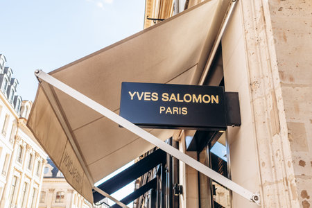 Paris, France - 23 February 2025: Yves Salomon boutique sign on rue Saint-Honoré, black and gold logo, luxury fashion store exterior in Paris