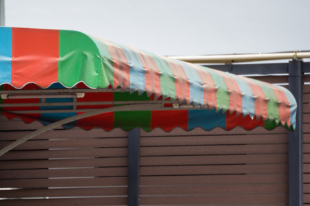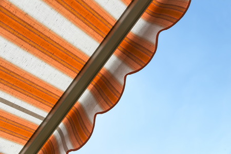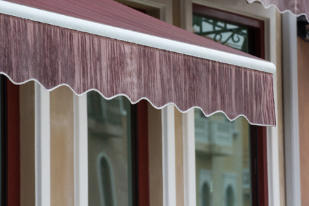 sunblind awning on the building. striped sunblind awning. sunblind awning on window.