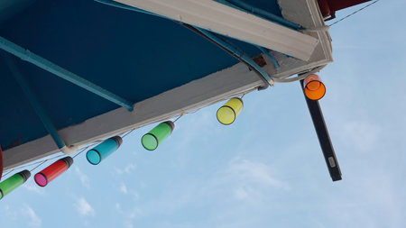 Colorful lanterns on roof. Action. Multicolored glass light bulbs hang from roof of house. Beautiful colorful lights on blue sky background
