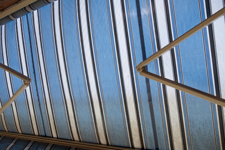Yellow and white canopy under blue sky. Summer time. Horizontal