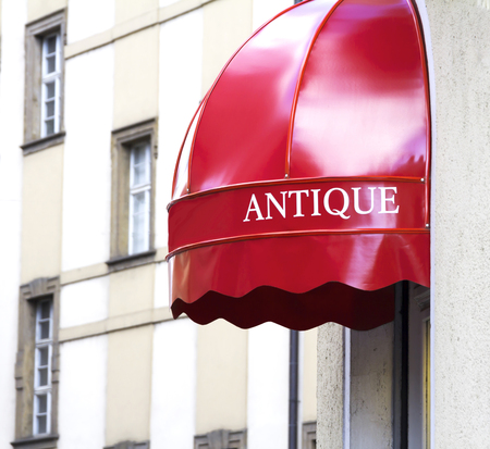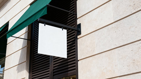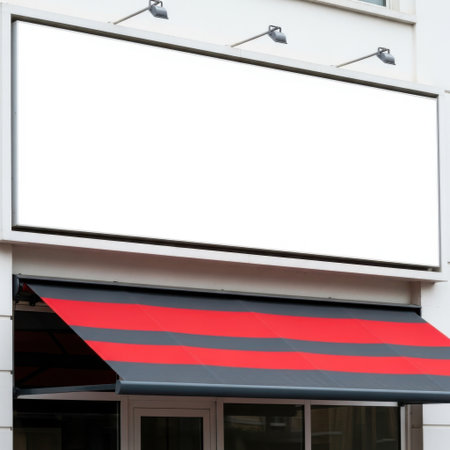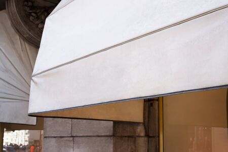 Coffee shop empty, clean white awning for logo mockup. Traditional look of white white set in front of window