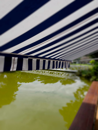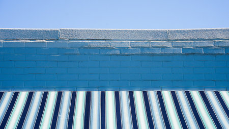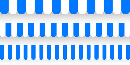 blue and white awnings over glass window in hotel, concept decoration for shading
