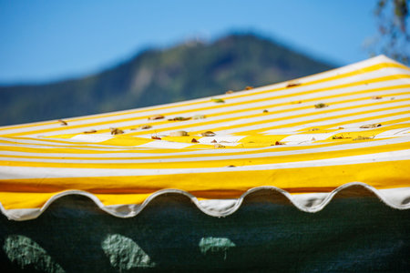 Yellow and white striped canopy with fallen leaves against mountain backdrop.