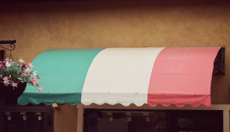 Text caffetteria on sunblind. Italian coffee shop. Facade on coffee shop. Green foliage in front of cafe and sweets shop.