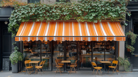 Cozy outdoor seating area at a cafe features bright orange striped awning. Lush green vines cascade down the facade, creating a welcoming atmosphere for guests.