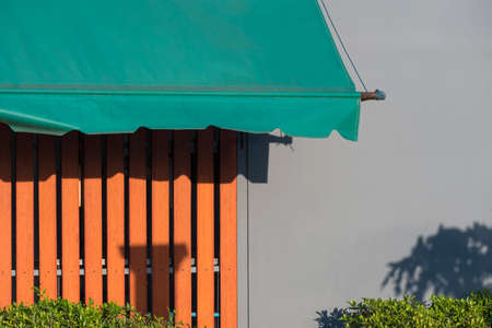 Sunlight on surface of green canvas awning with wooden plank and gray cement wall of vintage house
