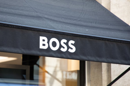 Bordeaux , Aquitaine France - 05 29 2023 : hugo boss logo brand and text on shop facade wall sign in the main shopping street of the city