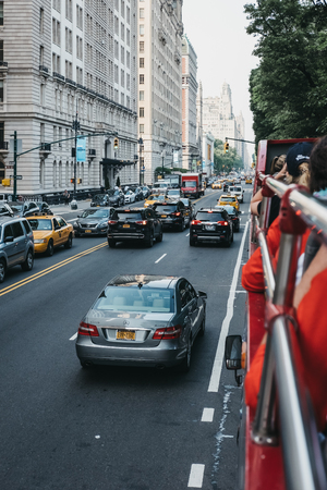 New York, USA - May 31, 2018: View of Central Park West from tourist bus. The street is a part of Central Park West district added to the National Register of Historic Places on November 9, 1982.v