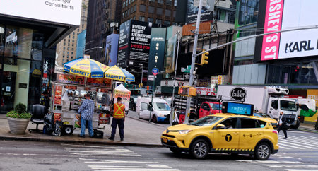 Sabrett Hot Dog Cart in Times Square with Yellow Cab