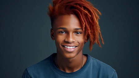 Cheerful smiling African American red-haired teenager guy with long red-haired hair and perfect skin, dark blue background. Advertising of teenage cosmetics, hair care products, medicines, perfumes, cosmetology, courses, college schools and trainings