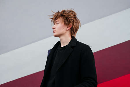 Thinking young man with birthmarks, moles, wart on face in black coat standing in front of colorful wall on a city street and looking away. Handsome man waiting for someone. Breathing fresh air.