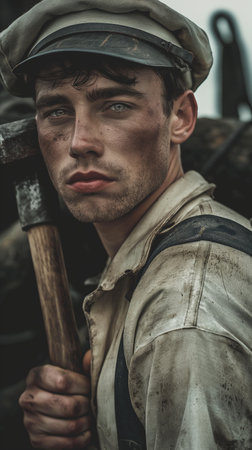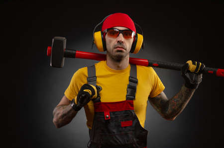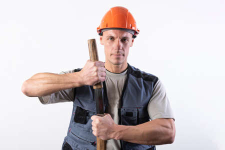 A builder with a big sword on his shoulder. Repairman wearing a helmet and work clothes. For any purpose.