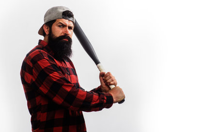 Aggression or anger and violence concept. Attack concept. Man unshaven face hold baseball bat. energy and fashion. Strong temper. Bearded man hold baseball bat. Ready to swing.