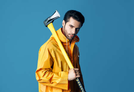 Portrait of brutal handsome man in bright raincoat holding big axe