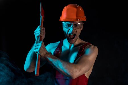 screaming sexy shirtless fireman in helmet holding flat head axe in darkness