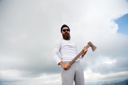Hipster with beard on strict face holds axe, cloudy sky background. Man with beard holds axe while stand on top of mountain. Hipster looks brutal and stylish with sunglasses. Conqueror of top concept
