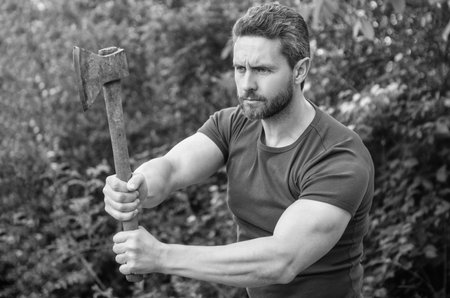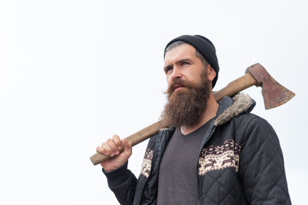 bearded man lumberjack has axe, copy space. bearded man lumberjack with axe.