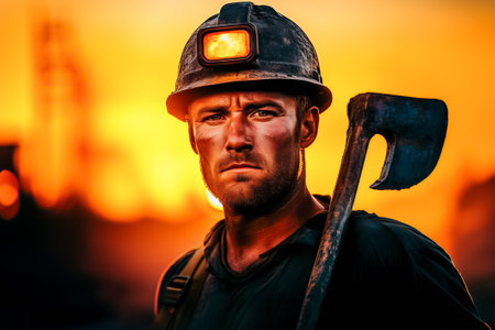 A miner worker emerges from the depths, showcasing strength and grit against a striking sunset background.