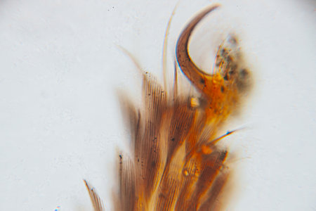 Closeup zoea stage of Vannamei shrimp in light microscope, Shrimp larvae under a microscope, Shrimp, White shrimp, Nauplius, zoea, Larvae. Background.