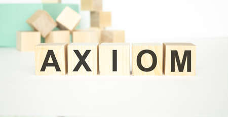Word Axiom. Wooden small cubes with letters isolated on white background with copy space available. Concept image.