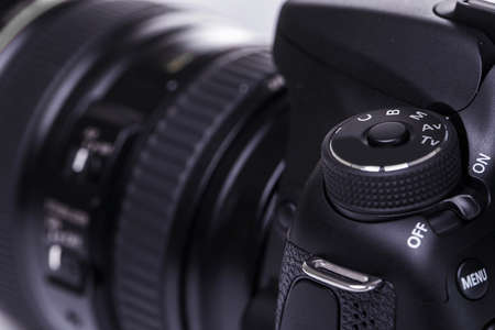 DSLR Digital Camera full frame sensor of EOS Canon 5D mark IV with Canon lens EF 135mm f 2L USM on gray white cement background.