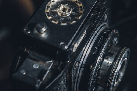 Macro and shallow depth of field image (selective focus) with the markings on the lens of a very old bellows photo camera (exposure time and f-stops).