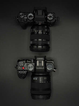 Fujifilm X-T4 and Panasonic Lumix S5 are black top cameras from well-known manufacturers. Competition. Dark background. Macro.