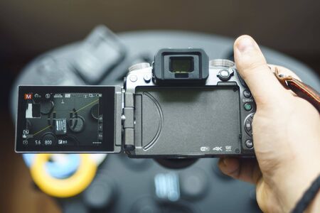 BISHEK, KYRGYZ REPUBLIC - APRIL 24,2018: Photo of PANASONIC LUMIX G7 mirrorless camera with digital display from behind. Man is holding the camera top view