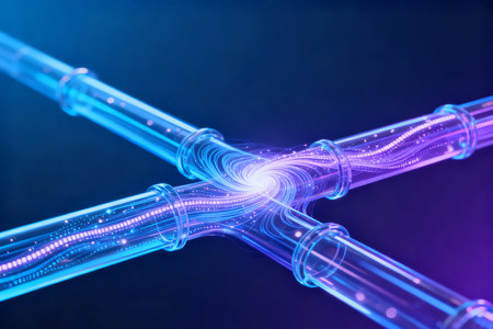 A close-up view of interconnected glowing nodes emitting vibrant blue and pink light trails, forming a complex and dynamic digital network.