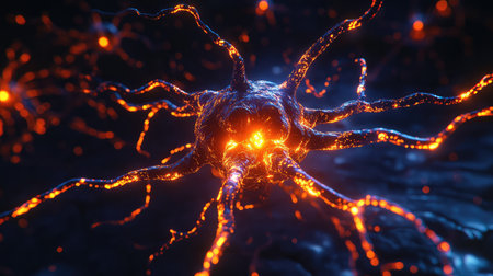 AI Generated. Microscopic view of a neuron with bright glowing ends