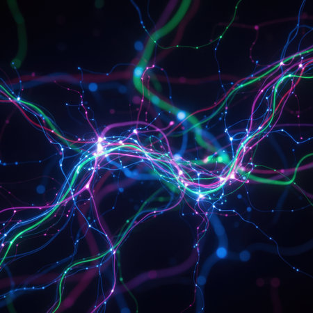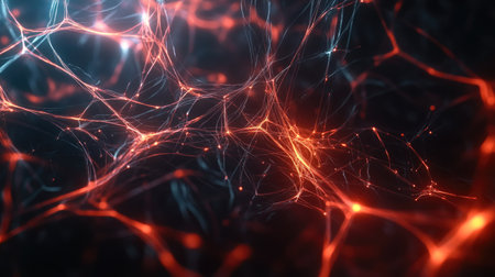 This vibrant abstract image showcases a network of glowing neurons and connections, symbolizing the complexity and beauty of technology and biology in motion.