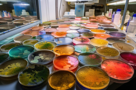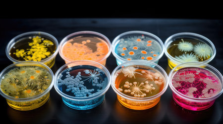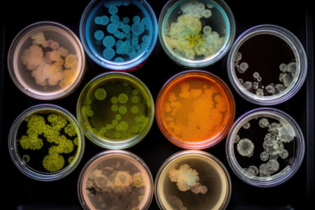 lab with unique and unexpected microbial cultures in petri dishes, including colorful and natural environments, created with generative ai