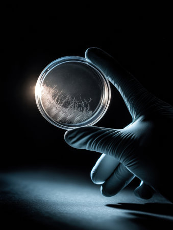 A scientist holds a petri dish displaying resistant growth in a laboratory, illuminated by a spotlight that highlights the specimens details.