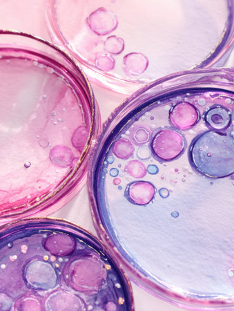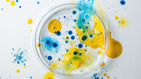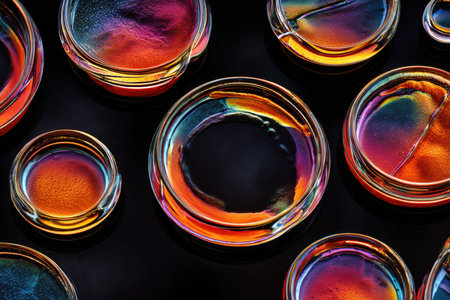 Abstract view of a petri dish with a colorful mix of oil and water droplets, reflecting a blend of scientific and creative concepts.