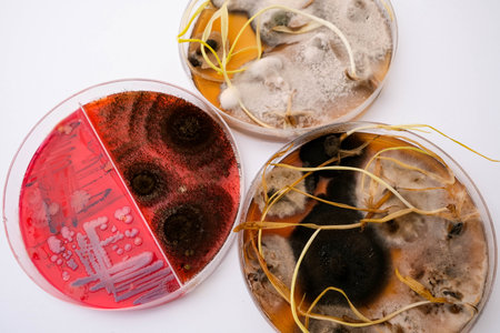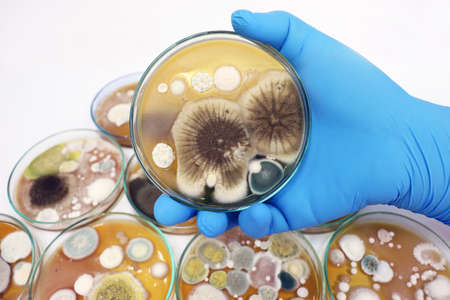 Mold and other fungi samples grown in laboratory petri dishes for mycology and microbiology research