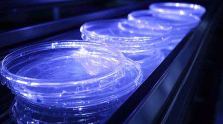 A visually striking image of clear plastic petri dishes arranged in a laboratory environment, enhanced by blue lighting that casts an intriguing glow, perfect for scientific and educational themes.