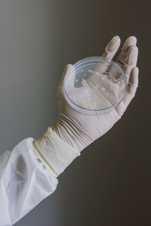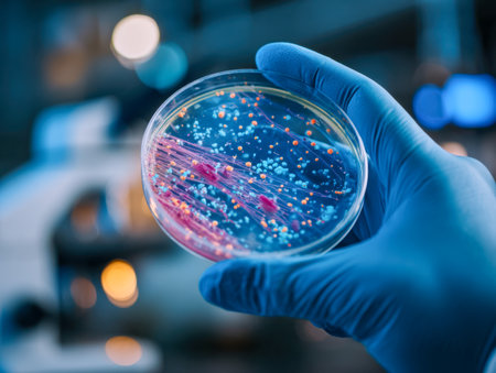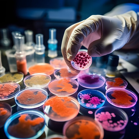 Gloved hands of a scientist examining vibrant microbial colonies in petri dishes, conducting research on infectious diseases and developing new treatments