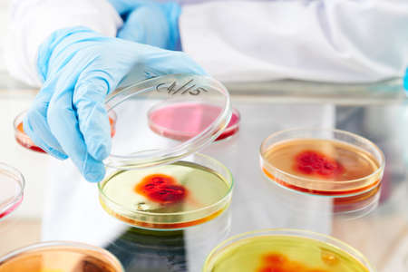 Gloved hand of scientist opening petri dish with bacteria