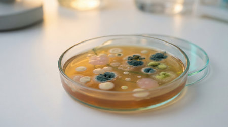 Diverse microorganisms growing in a petri dish in a lab.