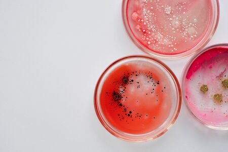 Viruses and bacteria in a Petri dish, various analyses in the laboratory. Virology and virus research, concept. White background copy space.