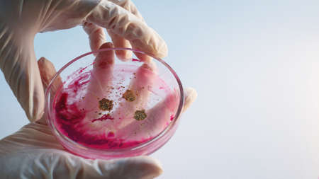 Bacteria or microbes of pink color in a petri dish in the hands of a human in medical gloves, scientific research of viruses, sunlight
