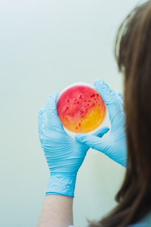 Female researcher cultivating bacteria in petri dish