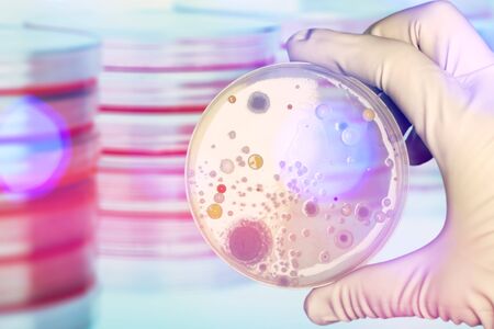 Scientist hand holding Petri dish with multicolored bacterial colonies