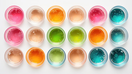A photo showcasing a collection of various liquids, each in its own plastic cup, Petri dishes filled with vibrant bacteria cultures, AI Generated