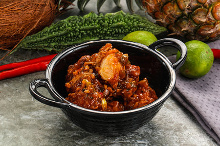 Thai Spicy Chicken in white bowl on black background, Thailand.