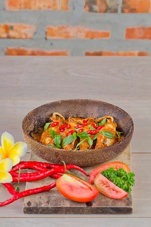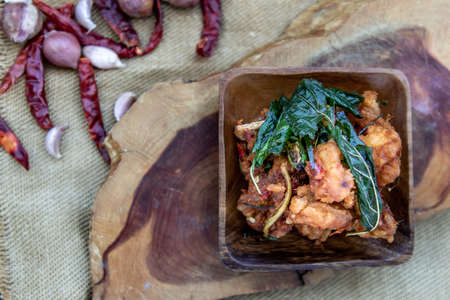 Thai Spicy food, Spicy Stir Fried Deep Fish Fillet with Herbs vegetables in wooden bowl : in Thai language called Pad Cha . Top view, Selective focus.