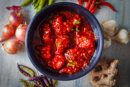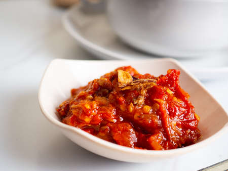 A spicy and delicious Indonesian chili sauce, with fresh basil leaves makes eating even more delicious.