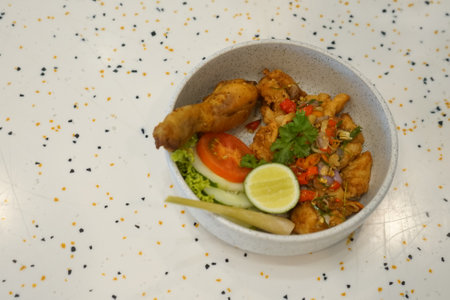Traditional Indonesian fried chicken better known as pecel ayam with chili sauce and fresh vegetables on a wooden table