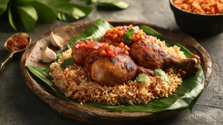 Experience the essence of traditional cuisine with this vibrant chicken biryani, beautifully arranged on a wooden plate, showcasing flavors and colors. Perfect for culinary enthusiasts.